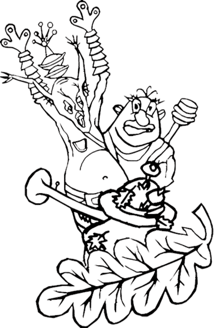 ВОЛК (удивляясь собственному вранью). Говорящие маринованные грибы. (В сторону.) Вот это я загнул!.. (Лешаку.) Они прилетели с планеты Грибов на праздник Поющих Бабушек. Фестиваль такой, знаешь, слетаются бабушки со всех сказок и поют весёлые песенки… (Показывает букет цветов.) Вот, я даже для победителей цветы приготовил. Кстати, грибы за столом будут основным деликатесом.