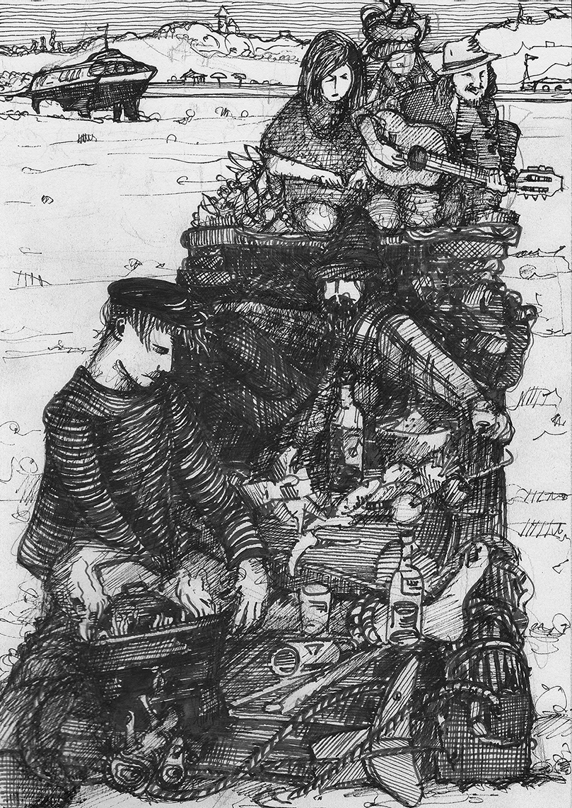 Я смотрел в открытую форточку на кудлатых коров, на очереди переездов, на бабок в оранжевых спецовках. Потом потянулись сплошные леса, топи, бурелом: промелькнул испуганный лось. Я курил и отхлёбывал горечь из фляжки. Когда я вернулся в наш вагон, поезд стоял на безымянном полустанке. Обе двери были распахнуты. Друзья сидели на железном полу, свесив ноги наружу. Поезд дёрнуло, на платформе наша миловидная соседка кричала: «У меня там ружьё, под солдатиком! Малой меня убьёт!». Манчо что-то сообразил и исчез внутри. Через минуту появился с ружьём и стал целиться в Володю Высоцкого. «В меня стрелять!» – заревел качок и сломал пластмассовое ружьё пополам. Мы передали обломки нашей благодетельнице. Она осталась печальная на перроне.