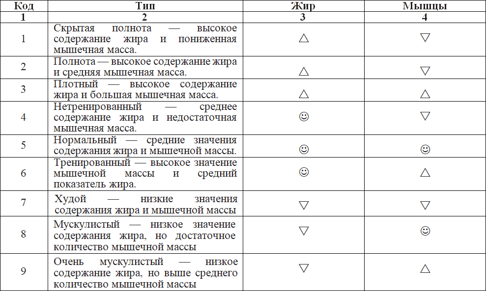 Благодаря этой методике весы-анализаторы показывают не только вес, но и другие важные составляющие вашего тела, помогающие делать выводы о том, правильно ли идёт процесс похудения. Очень важно представлять себе, почему мы прибавляем или теряем в весе. Например, не худеем ли за счет потери воды или мышечной ткани? Не остается ли вес стабильным из-за того, что жировая ткань уменьшается, а мышечная прибавляется? Не уменьшается ли минеральная составляющая костной ткани? Кроме того, модель «TANITA» показывает тип вашего телосложения, количество висцерального жира (откладывающегося на внутренних органах), а также определяет показатель базального метаболизма (ПБМ, у нас чаще принято эту величину называть ООВ основной обмен веществ) и метаболический возраст. Тип телосложения – этот параметр показывает соотношение количества жира и мышечной массы в вашем организме. Если количество жира в нем снижается, то меняется и показатель типа телосложения. Это очень важный показатель, потому что он сигнализирует об изменении состава тела – увеличении мышечной ткани и снижении жировой (или наоборот).