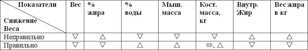 В таблице показаны основные изменения состава тела при правильном и неправильном снижении веса.