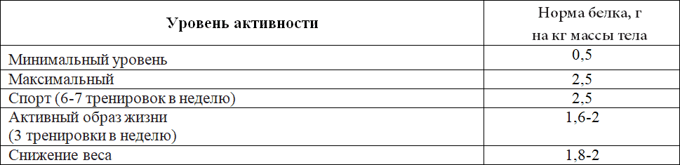 А если вы активны, снижаете вес, тренируетесь около 3-х раз в неделю – ваша норма 1,6–2 г на кг веса. Можно кушать ещё больше, если вы спортсмен, фитнес-тренер, бодибилдер или тренируетесь около 6-ти раз в неделю – количество белка может быть от 2 до 2,5 г на кг веса.