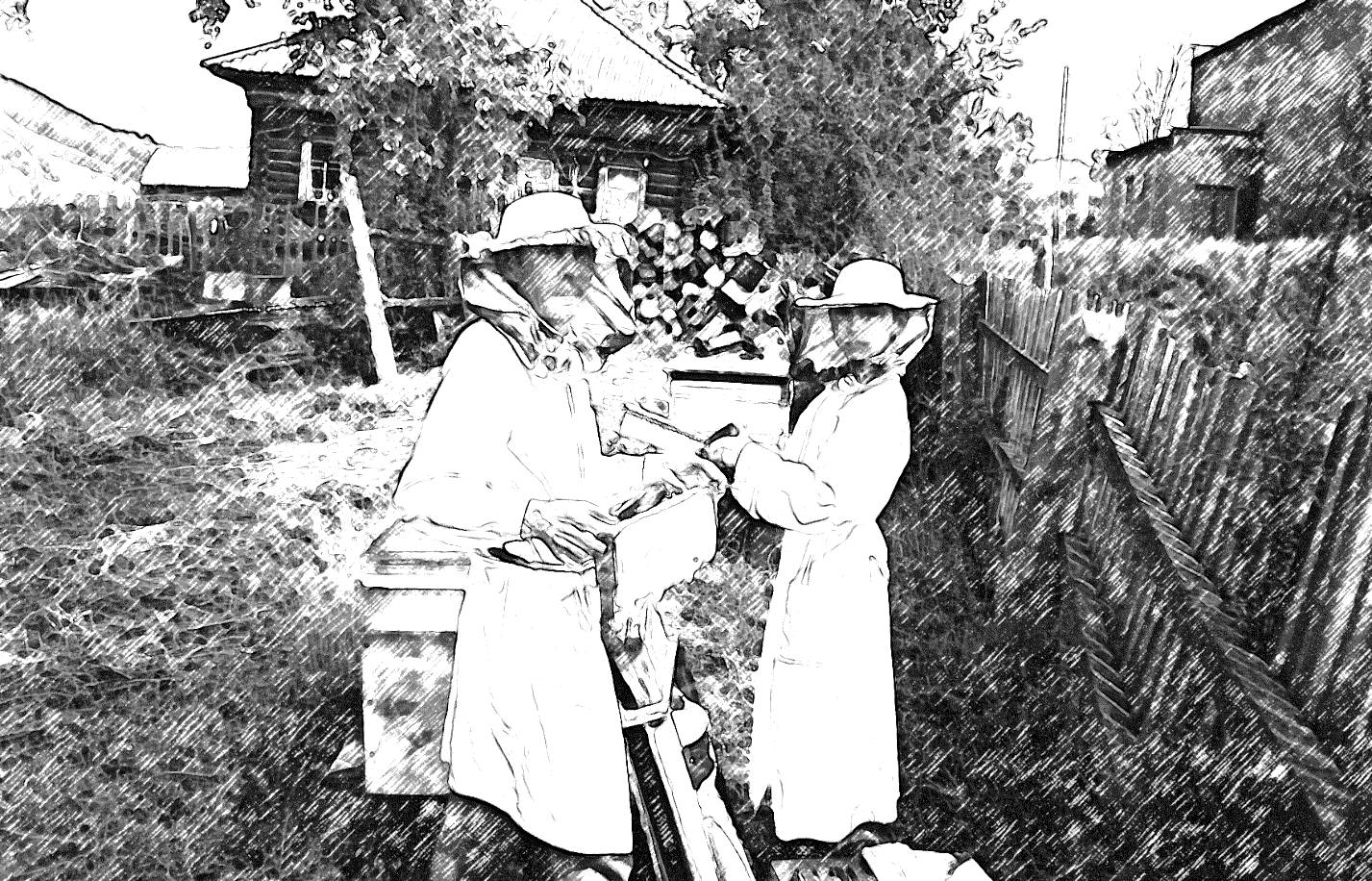 К ульям выходили по двое, так как необходимо было нести ящик, в котором были пустые рамки с сотами. Подходя к улью, попадаешь как будто из мира людей в мир пчел, вокруг летает несметное их количество и слышен легкий гул их крылышек. Одному предстояло снимать крышку с улья и доставать рамки с сотами, ставя полные в ящик, а пустые в улей. Второй в это время усердно работал дымарем, это такое приспособление, похожее на чайник, только вместо ручки кожаные меха, как на печах кузнецов, чтобы можно было нагонять внутрь воздух. В сам дымарь накладываются мелкие трухлявые колобашки и поджигаются. Как только они начинают тлеть, закрывают крышку с носиком и начинают усиленно раздувать угольки мехами, пока не появиться густой белый дым. Именно этим дымом и обкуривают пчел, когда открывают улей, потому что они, как и любые другие хозяева, в дом к которым лезут без их разрешения, начинают его защищать и бросаться на пасечников с целью ужалить и прогнать прочь. Дым действует на пчел одурманивающим и успокаивающим способом, они начинают вяло летать, ползать и никого не трогают.