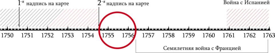 Как видно из рисунка, допустимое «окно событий» романа (незаштрихованный участок) простирается с 1755 по 1761 год. Если учесть ещё войну с Францией, оно сузится до двух лет – 1755-1756 (красный круг на картинке): довольно рискованно возвращаться с трюмом, полным сокровищ, на судне, оснащённом единственной пушкой – особенно если его капитан, как нам известно, не стал бы спускать британский флаг из какой-то там предосторожности.15 Владелец корабля встречи «с противным французом» опасается, но не до такой степени, чтобы отказаться от предприятия – стало быть, активных военных действий на море нет. И всё же мы не станем считать это условие абсолютно строгим: в конце концов, наши герои определённо склонны к риску. Так что ограничимся пока теми рамками, которые невозможно оспорить – ещё раз, это промежуток между 1755‑м и 1761‑м включительно.