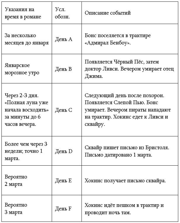 Сам автор не указывает даже десятилетия: «берусь за перо в год 17..». Однако, подсказок в тексте достаточно, чтобы установить время с точностью до года, а в нескольких случаях – до суток. Это и обстоятельства, упоминаемые самими героями, и движения луны и солнца, и три даты предшествующих событий: две написаны от руки на карте острова, одна фигурирует в дневнике Билли Бонса.
