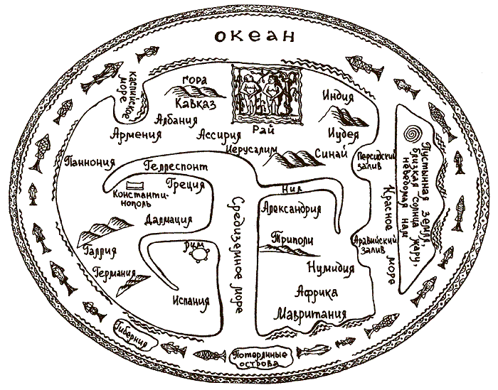 – Восток тут сверху, разумеется, где находится «Азия». На самом краю Востока, там, откуда восходит солнце, обретается Земной Рай. Слева от Земного Рая гора Кавказ.