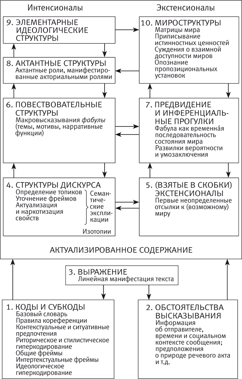 На рис. 0.3, пожалуй, лишь в одном-единственном отношении изображен реальный ход интерпретации текста: движение неизбежно должно начинаться в «ящичке» № 3 («линейная манифестация текста») – и нельзя «прыгнуть» из этого «ящичка» дальше, не пройдя хотя бы через «ящичек» № 1, обозначающий систему кодов и субкодов, необходимых для преобразования плана выражения в план содержания.