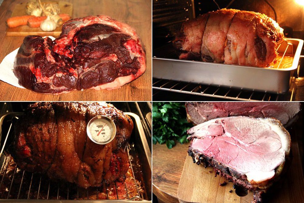 Натереть корнеплоды на крупной тёрке, чеснок мелко нарубить. Окорок натереть со всех сторон солью и перцем, обмазать 2 ст.л. можжевеловки и обложить тёртыми овощами. Завернуть плотно в пищевую плёнку и убрать в холодильник на 48—72 ч.