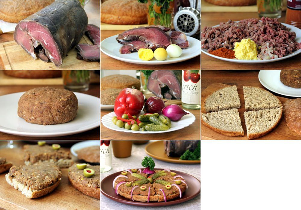 Четвертинка круглого ржаного хлеба, 1 небольшая луковица, 300 г сыровяленого или копченого окорока дикого кабана, 2 желтка яиц вкрутую, 1 ч.л. Кирша, 1—2 ст.л. воды, 1 ч.л. молотой паприки, острый перец на кончике ножа