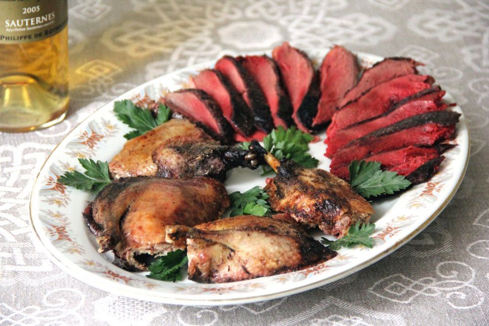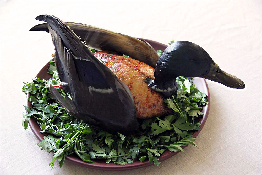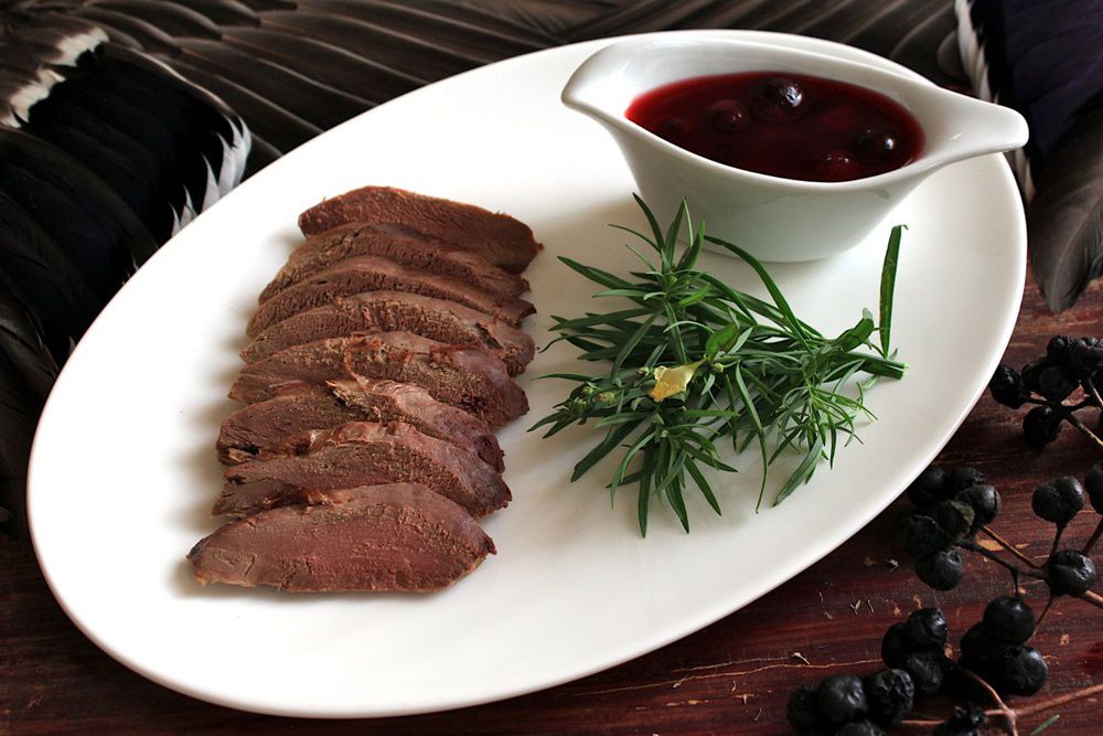 Испечь утку, отделить грудки от костей, нарезать ломтиками наискосок. Подавать с вареньем или желе из тёрна, вишни, смородины.