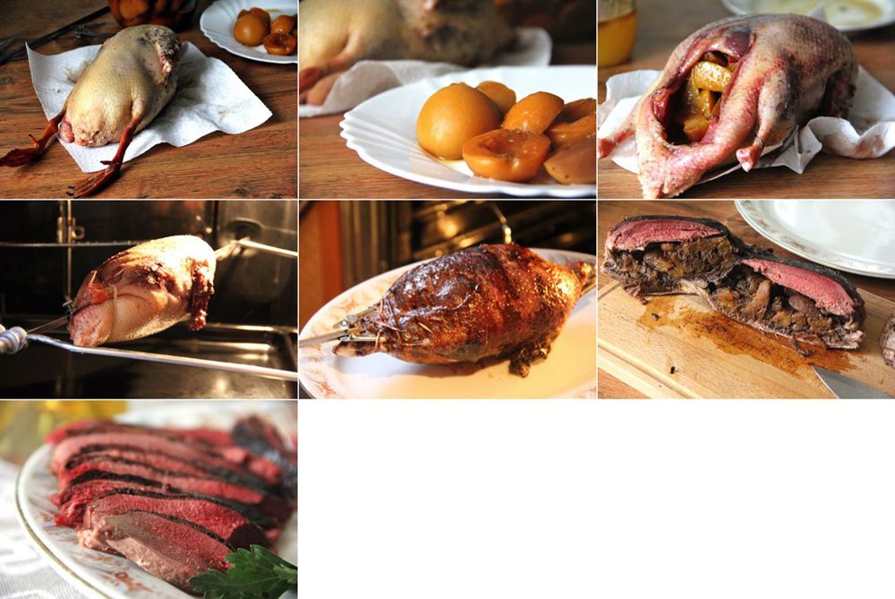 1 дикая утка или селезень (900—1100 г) 3—4 абрикоса или персика из настойки, соль, перец, 1 ст.л. настойки из персиков или абрикосов