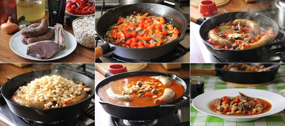 Для маринада вымыть овощи, очистить и нарезать. Довести до кипения вместе с пряностями в красном вине, остудить и залить мясо. Мариновать один—два дня в прохладном месте. Затем мясо вынуть, обсушить, срезать плёнки, посолить и поперчить. Разогреть 2 ст.л. оливкового масла в сковороде с высокими бортиками, обжарить мясо с двух сторон до зарумянивания. Влить заячью кровь и вино, накрыть крышкой и тушить приблизительно 50 минут. За это время очистить и нарезать чеснок и белые грибы. Разогреть 1 ст.л. оливкового масла на сковороде и обжарить с двух сторон тонкие ломтики грудинки, переложить их на тарелку. В той же сковороде обжарить чеснок и грибы, добавить мелкие томаты, прогреть в течение 2 минут. Затем переложить овощи в большую сковороду к зайчатине, по желанию добавить сметану, довести до кипения и перемешать. Подавать на стол с оливковым хлебом и вином, которое использовали при приготовлении. Украсить зелёным чесноком и петрушкой.