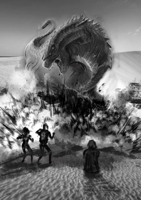 В тот же миг в том месте, куда он указал, мистическим образом начал ползти вверх песок, как будто кто-то засунул в него свои гигантские ладони и медленно начал поднимать их. Ужас и оцепенение охватили всех присутствующих, когда огромного роста существо начало подниматься из-под земли. Через мгновение перед ними стоял громадный монстр размером с двухэтажное здание. Он возник настолько внезапно, что ни у кого не возникло даже мысли спасаться бегством. С него потоками водопада стекал песок. Скорость, с которой он выбрался из-под земли, его мощь и величина парализовали каждого, и только сдавленный голос Йака на несколько секунд вывел всех из оцепенения.