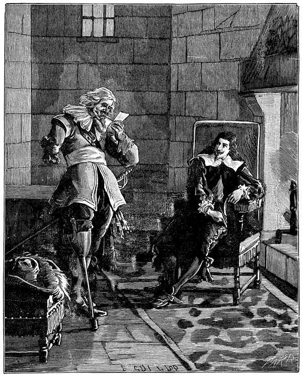 Мы сказали, что майор де л’Урсьер, комендант крепости, велел отвести графа де Бармон-Сенектера в помещение, которое будет служить ему тюрьмой до тех пор, пока кардинал не соизволит возвратить ему свободу. Это помещение оказалось довольно просторной, почти круглой формы комнатой, с выбеленными стенами в пятнадцать футов толщиной. Свет в комнату проникал через две узкие бойницы, забранные решетками: внутренней и наружной. Частые отверстия не только едва пропускали свет, но и полностью скрывали обзор. Часть комнаты занимал большой камин, напротив камина стояла деревянная кровать с тонким тюфяком. Когда-то кровать была выкрашена желтой краской, но от времени совсем побелела. Стол, скамейка, стул, ночной столик, железный подсвечник дополняли более чем скромную меблировку. Комната эта находилась на самом верхнем этаже башни, чья плоская крыша, по которой день и ночь прохаживался часовой, служила ей потолком.