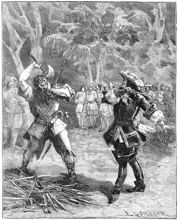 От этой жестокой обиды молодой офицер сделался бледен как смерть, по его телу пробежала нервная судорога. Он схватил шпагу дрожащей рукой, взмахнул ею, со свистом рассекая воздух, и плашмя ударил буканьера по щеке.