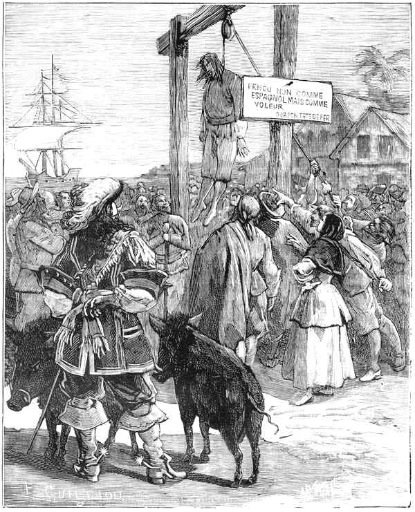По приказанию Медвежонка Железная Голова на груди казненного красовалась табличка с надписью по-испански и по-французски для объяснения грозного смысла смертного приговора: