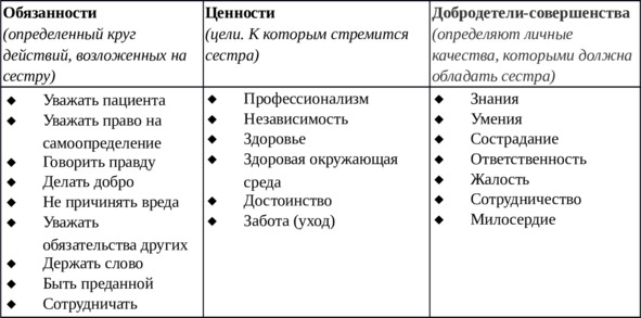 Сестра, разделяющая философию СД, принимает этические обязанности, ценности и добродетели, которые определяют этический кодекс медсестры в каждой стране, в том числе и в России.