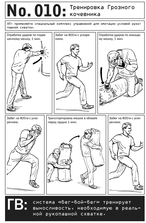 Спецагенты тренируются по самым сложным в мире программам, которые для имитации боевой обстановки сочетают и нехватку сна, и настоящие взрывы, и много чего еще. После прохождения основного курса физподготовки оперативники поддерживают боеготовность, тренируясь по системе «бег-бой-бег». Регулярных упражнений с гантелями недостаточно, чтобы одолеть противника в рукопашной схватке после изнурительной погони по пересеченной местности – поэтому в физической подготовке Грозного кочевника приоритет отдается настоящему бою и приемам самозащиты, а не накачиванию мускулатуры. Традиционные упражнения на развитие силы и укрепление сердечно-сосудистой системы тоже присутствуют, но именно «бег-бой-бег» развивает выносливость, помогающую «дожать» противника в схватке после преследования.