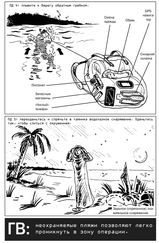 До берега он плывет на боку, спецназовским обратным гребком, при котором пловец почти не возвышается над поверхностью и рука не выносится из воды. Выбравшись на берег, переодевается в сухую одежду и с помощью лопатки выкапывает тайник для снаряжения.