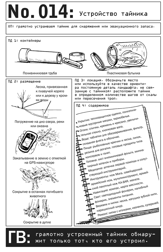 Снаряжение, законсервированное для будущего применения, можно спрятать самыми разными способами. Защитив от внешних воздействий износостойким контейнером типа пластиковой бутылки или обрезка поливиниловой трубы, его можно скрыть в пещере, в дупле, на дне озера и пр. Чем безлюднее место, выбранное для тайника, тем лучше: нельзя допустить того, чтобы к твоему возвращению тайник минировали или приставили к нему наблюдение. Устройство тайника в непросматриваемом месте снижает вероятность его случайного обнаружения. Сохранение координат на GPS-навигаторе поможет найти тайник при отсутствии визуальных ориентиров.