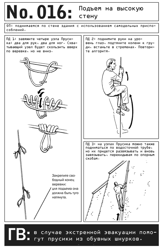 Прусик (узел Прусика) – страховочный узел, применяемый альпинистами, – вяжется таким образом, что может двигаться только вверх по веревке или стержню: рывок вниз затягивает его, фиксируя на месте. Привязанный к снаряжению агента, прусик надежно страхует его и удерживает от падения в ситуациях, когда другие средства страховки не срабатывают. В случае проникновения или эвакуации можно применять этот узел, скользящий вверх по веревке и затягивающийся, если к нему приложен вес человеческого тела.