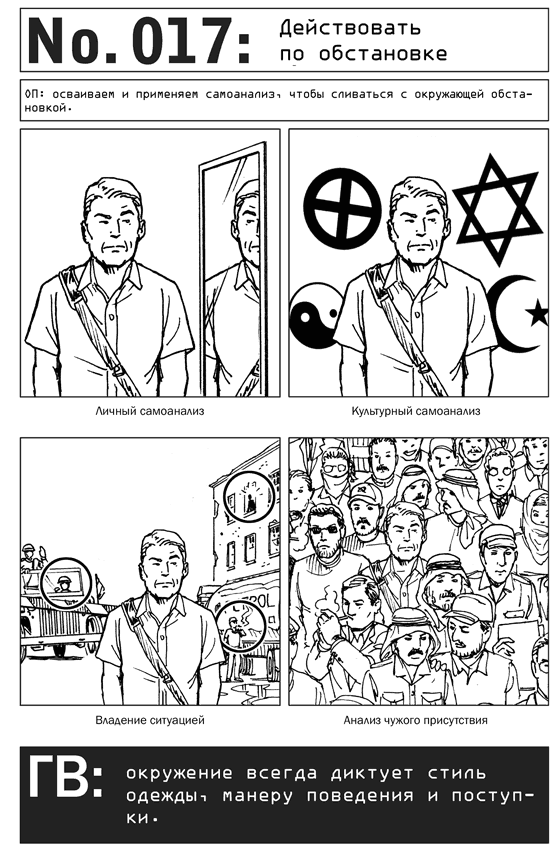 Второй аспект соответствия среде – культурный: надо постоянно оценивать свои действия и предпочтения на предмет соответствия местным обычаям. Если у местного населения не принято мазать бутерброд кетчупом и класть в напитки лед, агент будет поступать так же.