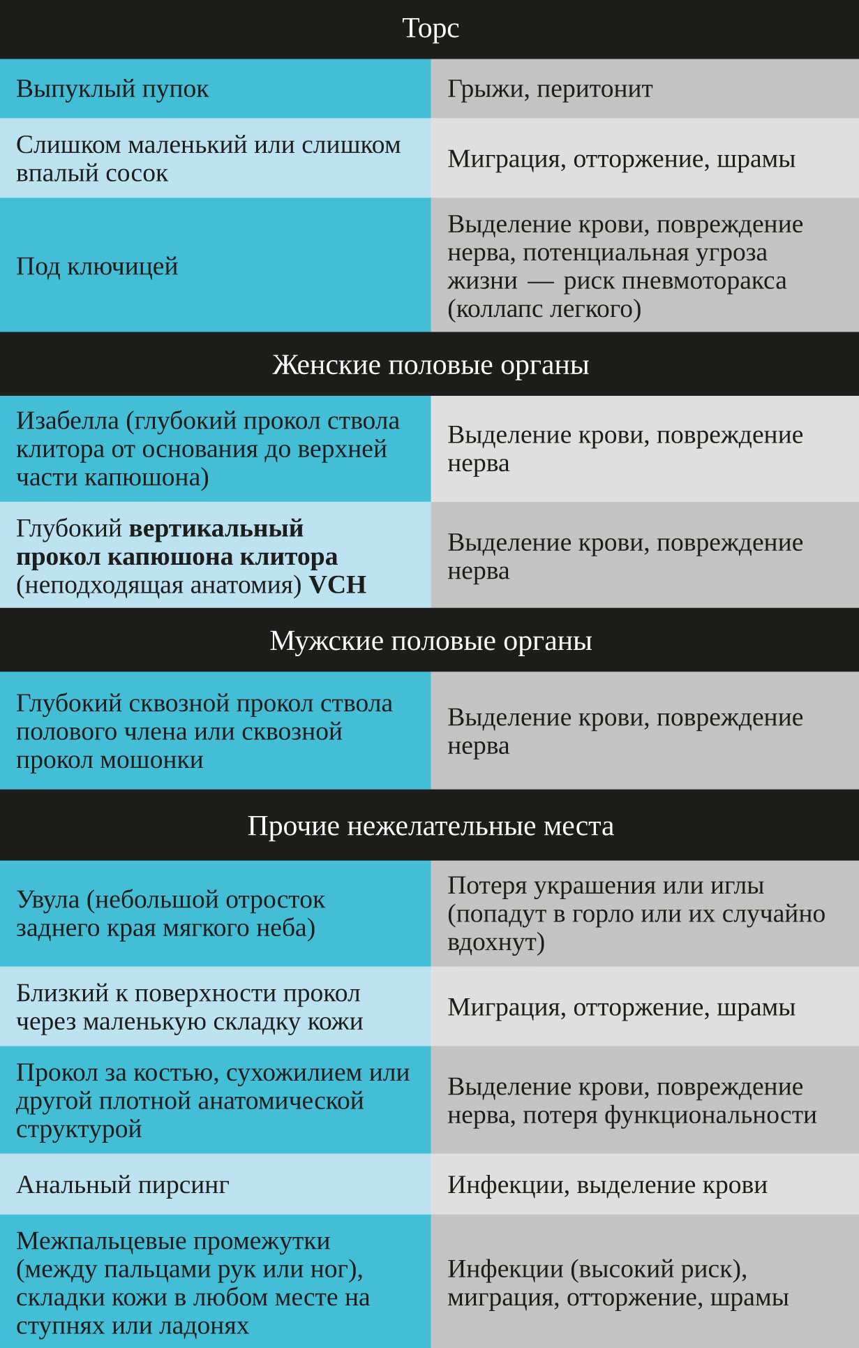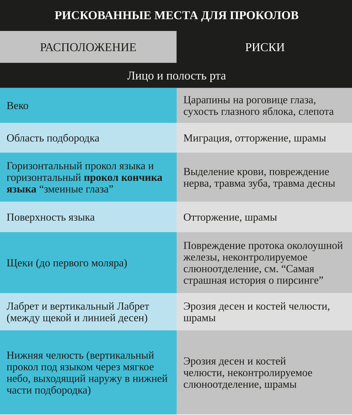 Некоторых проколов лучше заведомо избегать, так как они рискованны сами по себе и редко полностью заживают. Однако в Интернете сегодня можно встретить множество фотографий подобных спорных проколов – и все они толкают нас на безрассудства. Если кто-то согласится сделать вам подобный пирсинг (и даже будет утверждать, что имеет опыт) – это вовсе не означает, что все пройдет безопасно. Поэтому я, будучи острожной, советую вам избегать определенных видов пирсинга, перечисленных в следующей таблице.