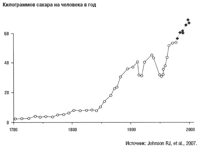 Посмотрите, как резко выросло потребление чистого сахара (в килограммах на человека в год) на Западе начиная с XVIII века: