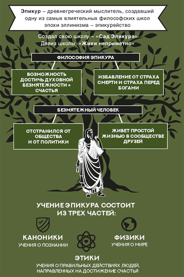 Эпикур считается основателем одной из четырех главных школ эпохи эллинизма: наряду с эпикурейцами в это время были популярны стоики, скептики и неоплатоники. Историки обычно начало этой эпохи связывают с завоеваниями Александра Македонского. Однако провести хронологическую черту между классической и эллинистической мыслью непросто. Аристотель фактически жил в эту эпоху, но оставался философом классической Греции, в то время как жившие ранее киники уже предвещали философию эллинизма. Отличие, скорее, заключается в том, что философия эллинизма – это философия империи, в то время как классическая – полиса. Для полисной философии человек, понимаемый как «животное политическое» и как микрокосм, оказывается гомологичным полису, а затем и космосу. Но внутри империи человек не может себя осознавать тождественным социуму – его голос просто не слышен на площади, он не может телесно, глазами, ногами, как того требовал в своей «Политике» Аристотель, измерить империю; он зачастую не может охватить умом процессы, определяемые верховной властью, находящейся далеко от простого человека. Он чувствует себя потерянным в несоразмерном ему мире. Поэтому возникают различные специфические тревоги и страхи, а также необходимость их преодолеть и вернуть человеку гармонию с самим собой и миром.