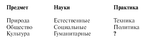 У естественных наук (физики, химии, астрономии, биологии и др.) есть область практической применимости – техника, которая преобразует то, что они исследуют: природу. Например, авиационная или космическая техника работает на основе принципов, разработанных физикой, и преобразует природу на основе познания ее законов[9]. Общественные науки (экономика, социология, юриспруденция, политология, география и др.) через свою практическую надстройку – политику – воздействуют на общество. На этой основе возникают практические дисциплины – разные виды политики: экономическая, государственно-административная, социальная, национальная, культурная, внутренняя, внешняя…[10]
