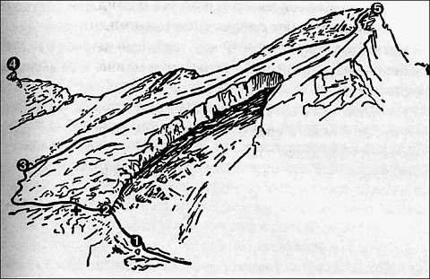 Разорванный ледовый гребень под самой вершиной производит странное впечатление. Он как будто причесывает густую шевелюру снежных вихрей, вздымаемых ветром. Разорванные клочья тумана проносятся над нами. Прямо над головой вздымается ввысь скала розоватого цвета, имеющая форму птичьего клюва. К этому "Птичьему Клюву"[94] ведет острое как нож скальное ребро.