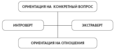 У нас получается четыре основных типа поведения в зависимости от соотношения осей «решение вопроса / отношения в коллективе» и «интроверт/экстраверт».