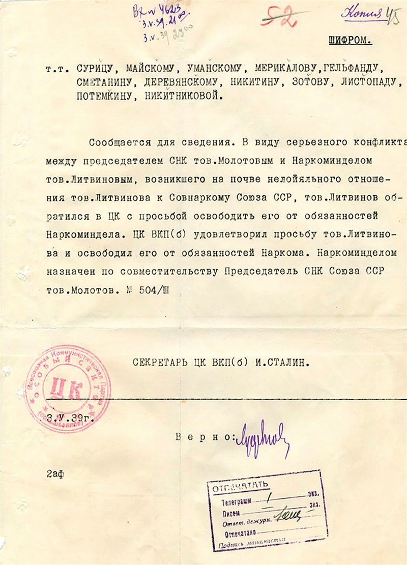 Секретная телеграмма об освобождении Литвинова от обязанностей наркома (АВП РФ. Ф. 059. Оп. 1. П. 313. Д. 2154. Л. 45)