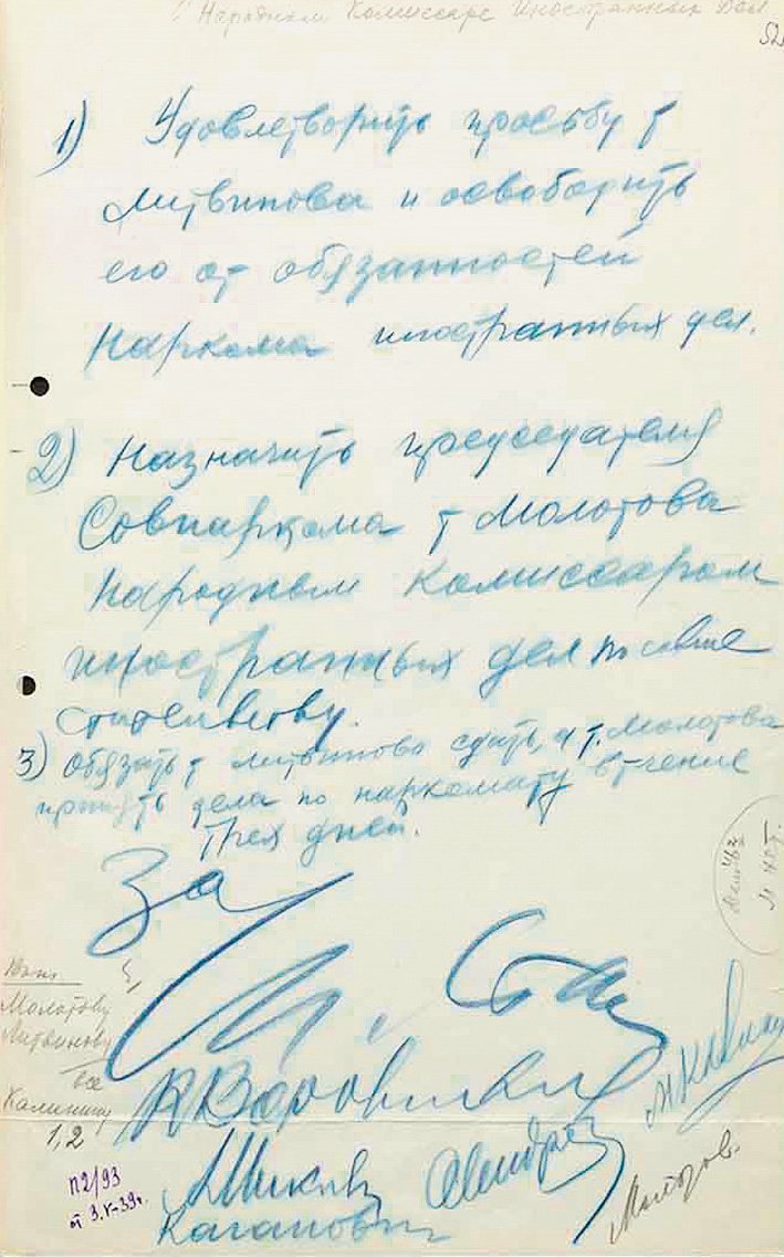 «1) Удовлетворить просьбу т. Литвинова и освободить его от обязанностей наркома иностранных дел.