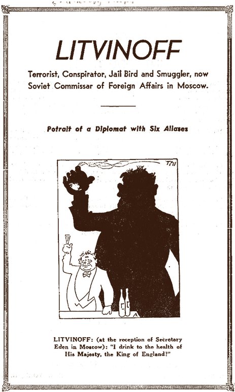 Родственники Литвинова упоминаются и в изданной в 1936 году неким «Гансом Андерсеном» антисемитском памфлете с длинным названием «Литвинов: террорист, заговорщик, уголовник и контрабандист, ныне советский комиссар иностранных дел»[40]. Этот типичный продукт нацистской пропаганды собрал все доступные данные о семье наркома. Со ссылкой на британскую «Дейли экспресс» там говорится, что его сестра жила в 30-х годах в Варшаве, где «домовладелец выкинул ее на улицу, поскольку она не могла уплатить сто марок долга. В тот раз она горько жаловалась, что ее знаменитый брат ничем ей не помог»[41]. Далее упомянут младший брат Литвинова Савелий (Шепсель), ставший незадолго до этого известным всей Европе – о нем тоже будет сказано далее. Говорится и о другом брате, который «откликается на имя ребе Янкеля Валлаха и проживает в Белостоке, Лодзи и Варшаве». Автор брошюрки живописует, как однажды этот бедный раввин пришел на железнодорожный вокзал, чтобы увидеть своего брата, проезжавшего через Белосток в Женеву: «Ему позволили несколько минут пообщаться с ним на платформе. Он много говорил о деньгах, которыми могущественный Меер Валлах мог бы с ним поделиться, но тот лишь дал ему сигару и поспешил обратно в вагон»[42]. Далее сказано, что сын раввина Азриэл смог добраться до Москвы, где пытался встретиться с дядей, но дочка последнего Татьяна отказала ему.