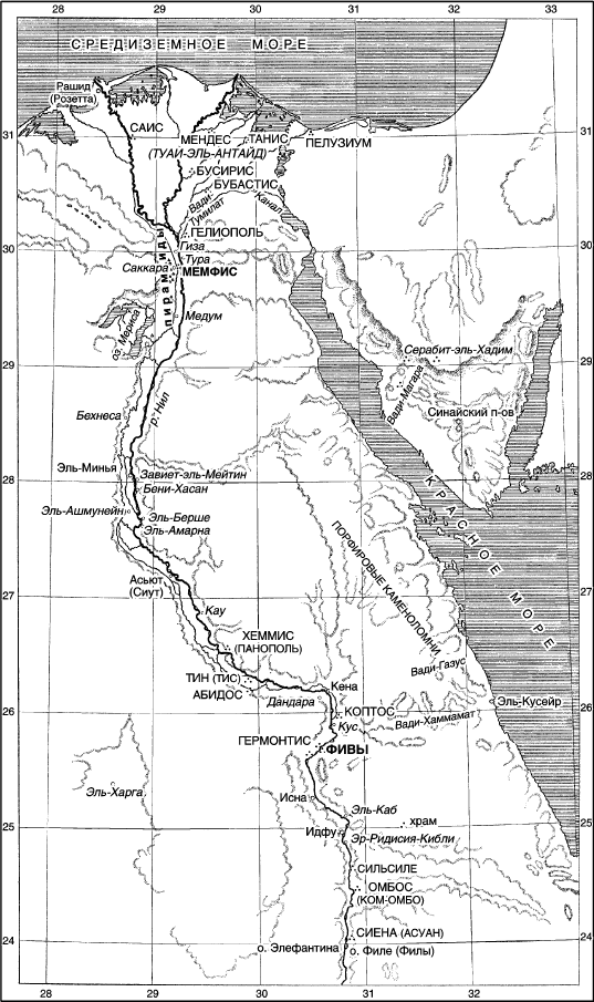 Дальше я намерен коротко рассказать о самых важных местах Древнего Египта – не для того, чтобы дать полный обзор географии этой страны, а чтобы помочь читателю понять, где расположены те места, которые чаще всего упоминаются в этой книге (см. прилагаемую карту).
