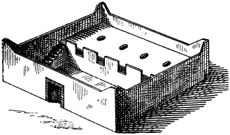 Конечно, между одним домом и другим могла быть огромная разница. Если мы не станем брать в расчет, с одной стороны, дома крестьян (которые, вероятно, жили в земляных хижинах, как современные феллахи), жилище горожанина, имевшего маленький дом на узких улицах города, представляло собой просто маленький двор и возле его задней стены – несколько комнат под плоской крышей и лестницу в один пролет высотой, которая вела на эту крышу. Такой план имеют сейчас в Египте хорошие деревенские дома, и ему соответствуют некоторые маленькие модели домов, которые хранятся в наших музеях, хотя модели, скорее всего, изображают кладовые, а не жилые дома[37]. Иллюстрация ниже – постройка, несколько похожая на коробку, – дает представление о форме, которую обычно имели эти маленькие жилища с толстыми наклонными стенами из ила, с тонким слоем деревянных планок под окнами; наверху устроен маленький второй этаж без передней стены и перед ним – плоская крыша. Единственное украшение этого маленького дома – толстый столб, вероятно сделанный из земли, как и похожие опоры в современных египетских домах.