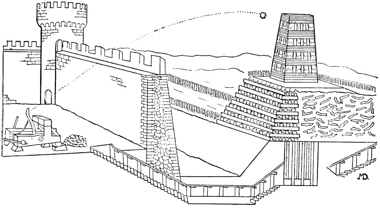 и) если город или крепость были окружены рвом, его заполняли там, где он смыкался с валом, и в других местах, где собирались пробить брешь. Стены разрушали двумя способами: либо используя таран, либо делая у крепостных стен подкопы. Если защитники крепости были начеку и строили внутри еще одну стену, брешь приходилось пробивать снова. Кроме того, защитники могли препятствовать подкопу;