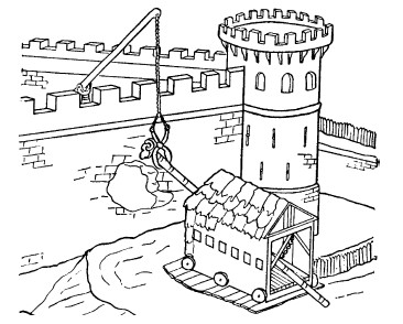 з) сооружение осадных башен (обычно на насыпи), которые ставились на колеса и приближались к стенам крепости. Передняя часть осадной башни покрывалась кожами, смоченными водой, чтобы башня не загорелась от случайно попавших стрел. У основания башни дежурили воины, чтобы не допустить разрушения башни предпринявшими вылазку защитниками крепости;