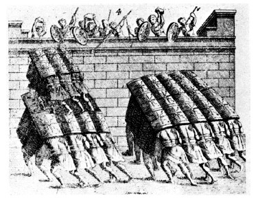 к) наконец, начиналась атака, обычно через пробитую в стене брешь. Иногда наступление проводилось, даже если не удавалось сделать брешь: нападающие спрыгивали с осадных башен на стены, забирались по лестницам или использовали теленоны. Иногда через подкоп удавалось заслать в крепость авангард войска, который открывал армии ворота и мог напасть на защитников с тыла. Римляне подводили к стенам крепости когорту под прикрытием «черепахи».