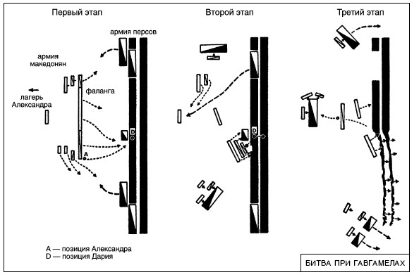 Лучшая пехота Дария была уничтожена при Иссе, и он рассчитывал в основном на кавалерию, колесницы и боевых слонов. Персидское войско выстроилось в две глубокие линии с кавалерией на флангах, в центре располагались греческие наемники и конная царская гвардия. Перед фронтом позицию заняли слоны. Ночная атака не состоялась, войска Дария оставались на позициях. Александр начал наступление эшелонами. Кавалерия готовилась нанести сокрушительный удар справа. За ней шли гипасписты. На левом фланге греческой и фессалийской конницей командовал Парменион. Позади каждого фланга македонской линии двигались колонны легкой пехоты и кавалерии. Позади центра, прикрывая лагерь, располагалась фаланга фессалийской пехоты. Македонское наступление сдвинулось на свою правую сторону, персидское же постаралось сдвинуться на левую сторону, создав несколько разрывов в своей линии. Александр повел кавалерию в атаку. Персидские крылья двинулись для окружения македонских флангов, но были отражены резервными колоннами Александра. Заметив разрывы в персидской линии, Александр направил туда свою атаку и прорвал строй противника. Дарий бежал. Среди персидских воинов началась паника. Однако левый фланг Александра, в свою очередь, отступил, будучи атакован силами персидской кавалерии. Бросок Александра в тыл атакующих устранил угрозу. Сражение закончилось, и Александр бросил свою армию в преследование отступающего противника. Македоняне потеряли убитыми 500 человек (возможно, 3 тыс. ранеными). Персидские потери неизвестны, но насчитывали, видимо, не менее 50 тыс. убитых.