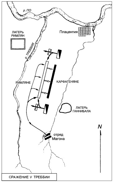 218, декабрь. Сражение у Треббии. Узнав о прибытии Ганнибала, Семпроний со своей армией направляется через Адриатику в долину реки По, чтобы соединиться со Сципионом. Ганнибал, усиливший за счет галльских рекрутов свою армию до 30 тыс. человек, вынуждает Семпрония перейти в атаку. Ганнибал контратакует продрогших после перехода через реку Треббия римских солдат, а в это время небольшое войско конницы и пехоты под командованием его брата Магона ударяет римлянам в тыл. Из 40 тыс. римского войска лишь 10 тыс. удалось спастись. Потери Ганнибала насчитывали более 5 тыс. человек.