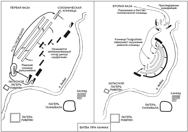 Все шло согласно планам Ганнибала. Хотя его центральный выступ и подался под римским натиском, но удержался. Варрон послал манипулы второй линии в интервалы между гастатами, затем приказал триариям и даже велитам присоединиться к атаке. Линия Ганнибала вогнулась, но не дрогнула. Тогда Ганнибал дал сигнал командирам африканских крыльев, пока еще не участвовавших в бою, а карфагенская кавалерия ударила в тыл римлянам. Паника мгновенно нарушила их строй, превратив легионы в хаотичную толпу. Лишь один отряд численностью 10 тыс. человек вырвался из окружения. К концу дня около 60 тыс. римлян, включая Павла, пало на поле боя. Еще 2 тыс. погибли при попытке занять хорошо охраняемый лагерь Ганнибала. Потери Ганнибала составили около 6 тыс. человек.