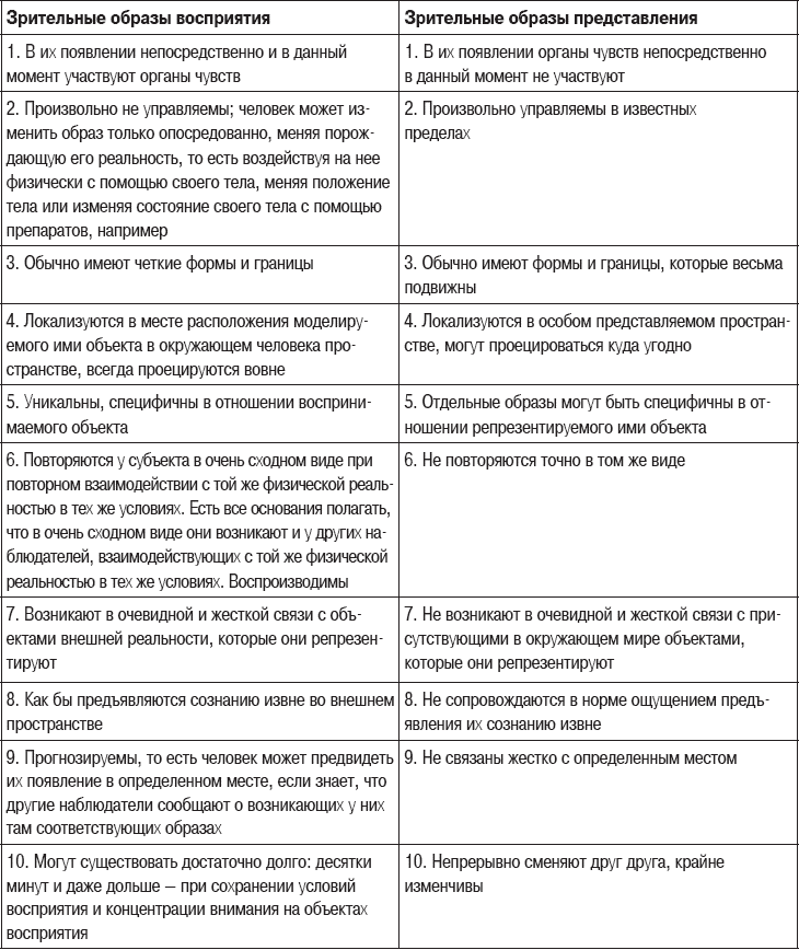 В табл. 2 представлены эти и другие различия между визуальными образами восприятия и представления, которые можно обнаружить в процессе интроспекции при обычном дневном освещении.