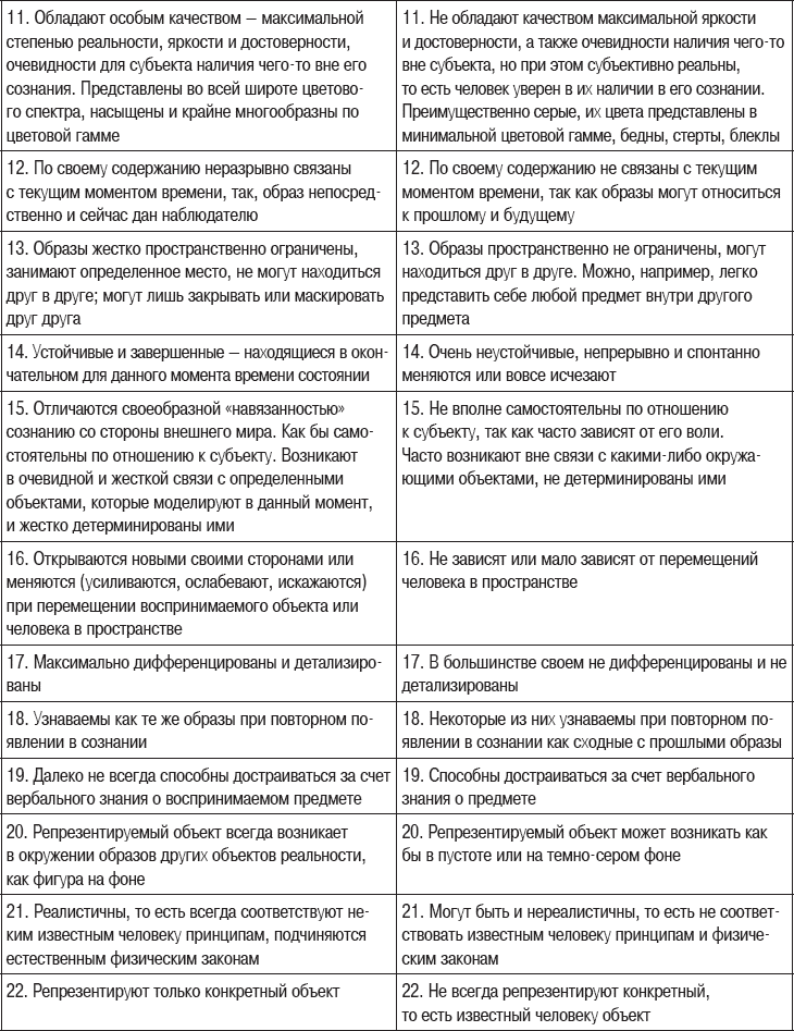 Необходимо отметить, что описанные выше различия между образами представления и образами восприятия верны лишь при определенных условиях – для зрительных образов, например, при достаточно ярком естественном освещении в состоянии обычного бодрствования субъекта. Если же мы попробуем сравнить их в сумраке или в особых состояниях сознания, то многие их качества резко изменятся, а различия частично сотрутся. Это касается, например, цветовой яркости, четкости границ, ясности форм, пространственных отношений между репрезентациями объектов и их удаленности от нас.