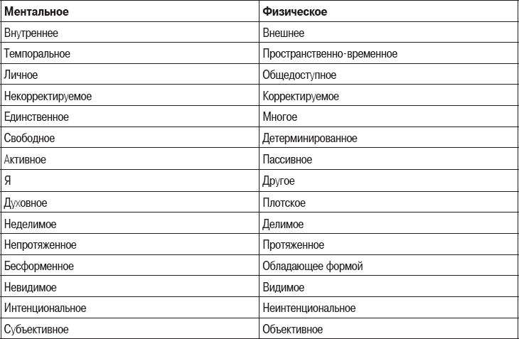 Можно констатировать, что предложенный С. Пристом список не предоставляет нам никаких возможностей для дифференциации ментального и физического. Как, впрочем, и следовало ожидать. Попытка разделить их обречена на неудачу так же, как и попытка разделить точку, находящуюся на пересечении двух прямых линий. Еще раз вспоминается в этой связи открытие У. Джеймсом того, что психическое и физическое различаются нами лишь вследствие контекста, в котором мы их рассматриваем.