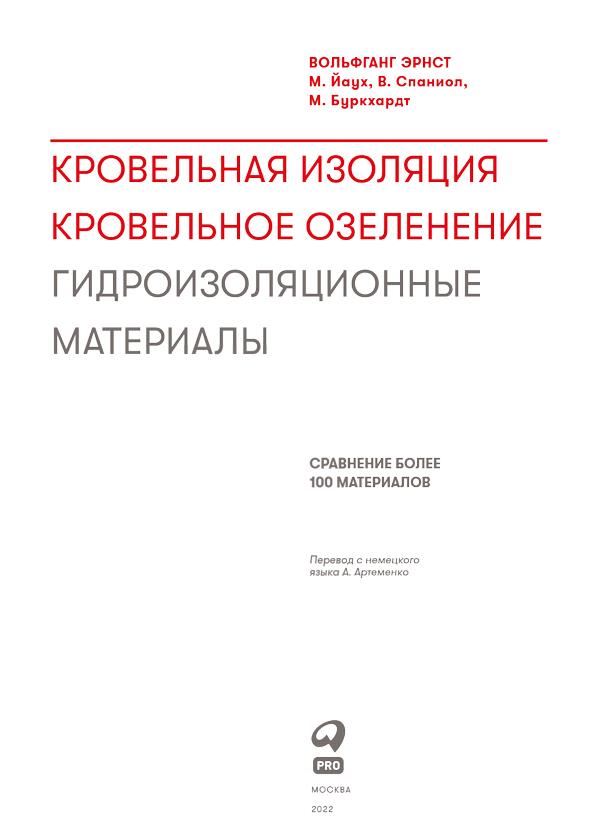Кровельная изоляция. Кровельное озеленение. Гидроизоляционные материалы: Сравнение более 100 материалов / Вольфганг Эрнст [и др.]; Пер. с нем. – М.: Альпина ПРО, 2022.