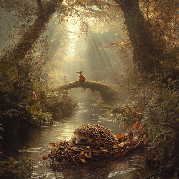 А вот и хитрая лиса! Сидит у мостика, смотрит, как плот приближается. Увидела ёжика – тут же вскочила на мост и растянулась поперёк, собираясь столкнуть ёжика в воду. Ведь лисы такие хитрюги – сбрасывают ежей в ручей, а потом нападают на них, когда они развернут своё мягкое брюшко.
