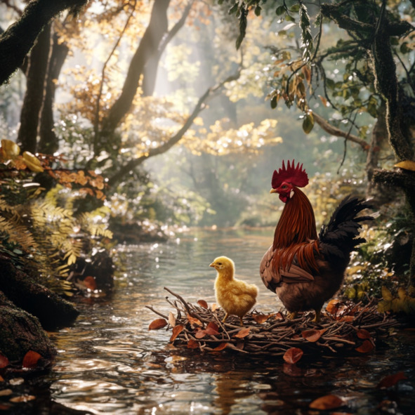 – Вот беда-то! – забеспокоился петух и решил догнать цыплёнка по берегу. Он бросился бежать вдоль ручья, вглядываясь вперёд в надежде увидеть жёлтый комочек на плоту, сделанном из тонких веточек.
