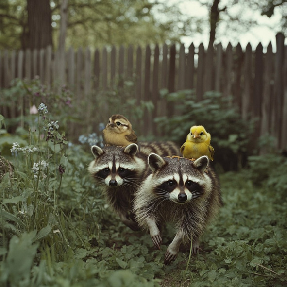 – Помоги мне! – закричал енот своему другу. Второй енот рванул на помощь, чтобы сбросить цыплёнка. Но тут в дело вмешался воробей. Он спикировал на спину второго енота и вцепился в неё своими коготками и клювом.