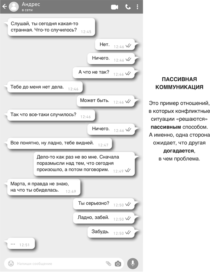 О коммуникации я уже писала в книге «Полюби свой пол», где представлено множество средств, техник и пошаговых инструкций для практики ассертивного поведения. Если ты ее не читал, знай, что существует три типа коммуникации: пассивная, агрессивная и ассертивная. Для разрешения конфликтных ситуаций рекомендуется придерживаться ассертивного поведения. Приведем наглядный пример для каждого типа коммуникации, чтобы получить представление о том, чем закончится спор в каждом конкретном случае.